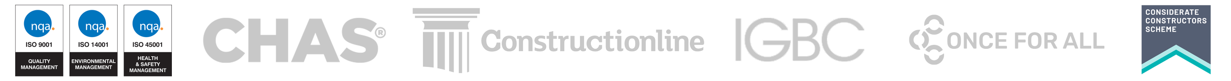 IIS Space is certified to NQA ISO 9001, 14001 and ISO 45001 standards providing assurance across Quality, Environmental, and Health & Safety Management. We are also a National award winner in the Considerate Constructors Scheme and active members of the IGBC Green Building Council, demonstrating our dedication to best practice and sustainability in construction. Additional certifications include Once For All, CHAS and Constructiononline, all reinforcing our trusted reputation across the commercial fit-out sector.