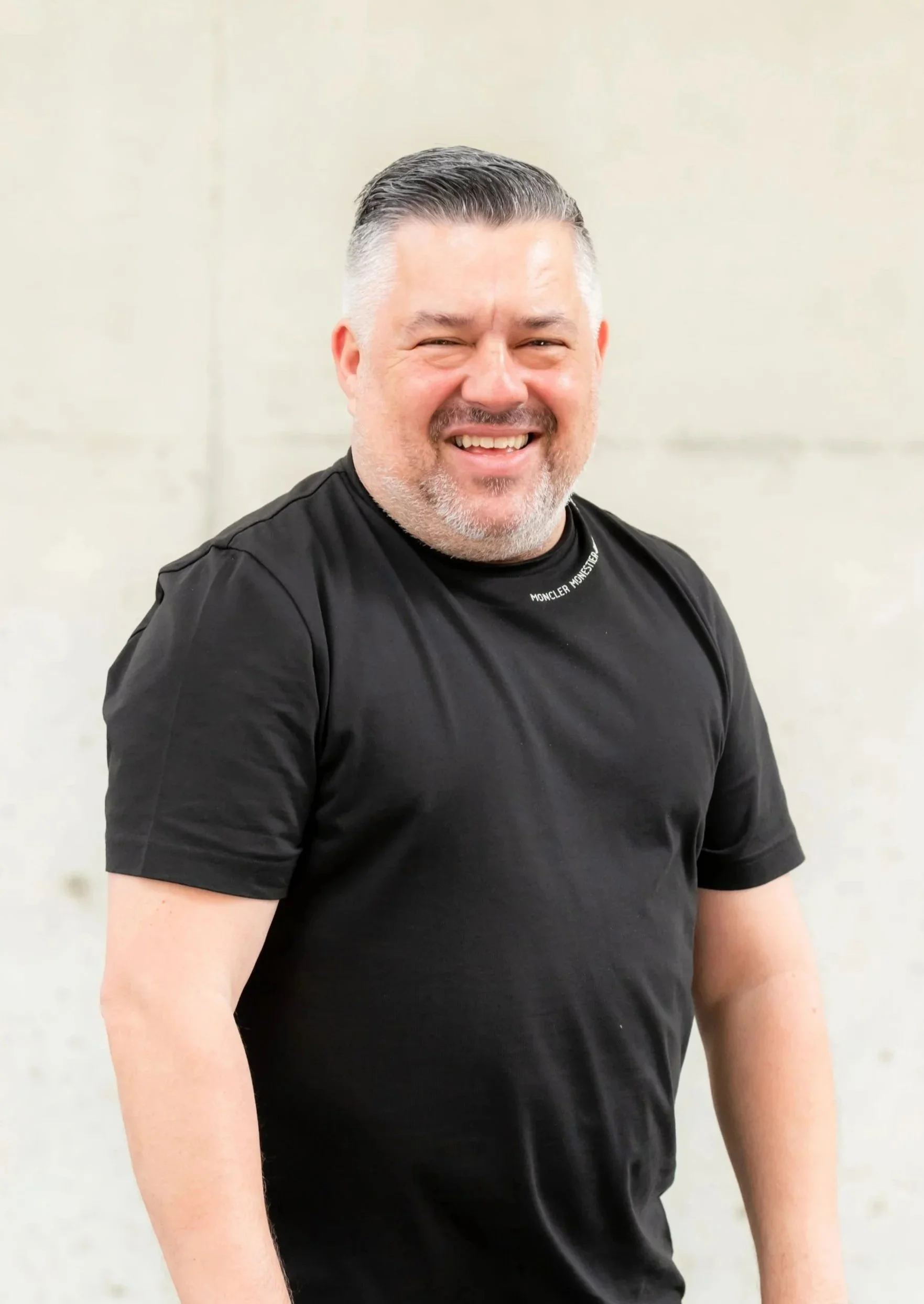 A smiling man with short dark hair and a beard, wearing a black T-shirt, standing against a plain light-colored wall.